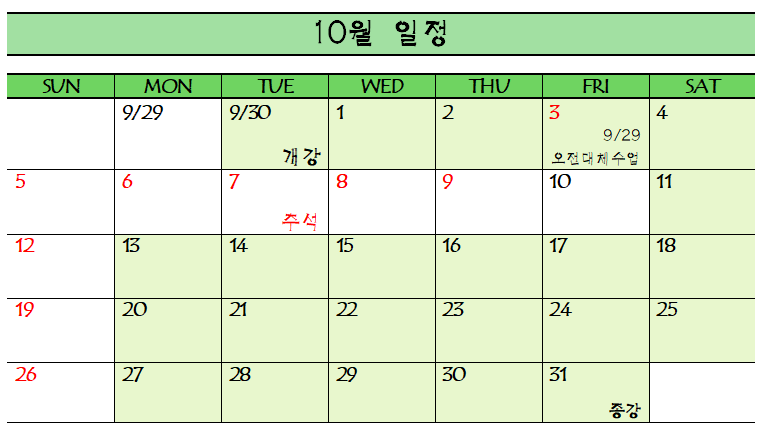 9월 29일(월) 수업은 효은선생님 개인적인 사정으로 10월 3일(금) 오전 수업으로 대체 진행됩니다. 많은 양해부탁드립니다.